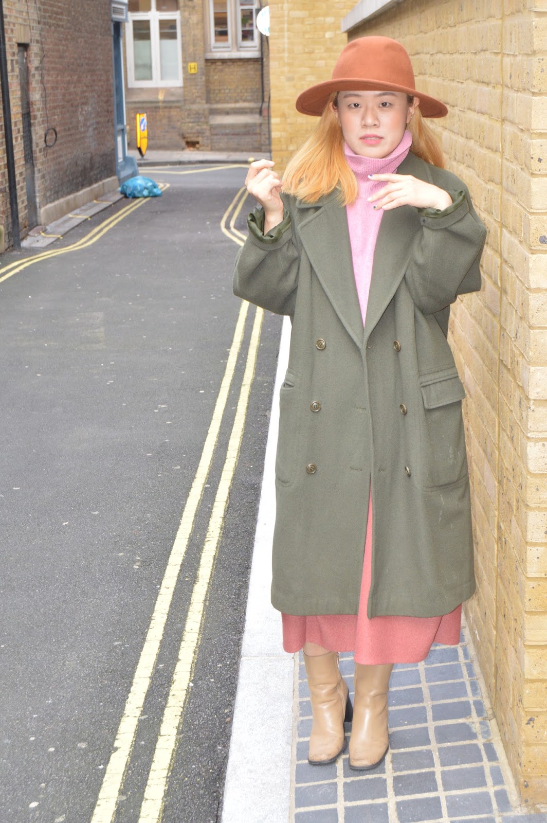 The stylist walking the sidewalk at London Fashion Week is Steal her winning colour-blocking style by matchig a runway orange fedora by Rag & Bone, or Bada with Chloé (or STYLEBYYAM) dusty pink roll neck sweater, Diane von Furstenberg green coat, Altuzarra (or Styleberry) orange skirt and Gianvito Rossi(or JY Shoes) camel shoes.